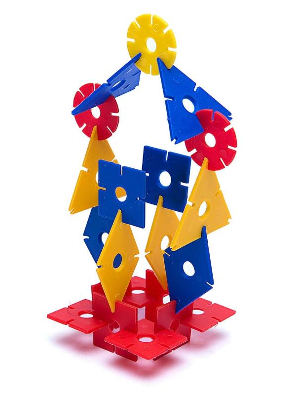 В комплект входят плоские геометрические фигуры (квадрат, ромб, треугольник, круг) с прорезями для соединения.