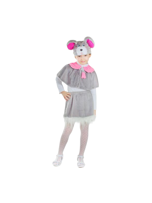 Юбочка с белыми оборками и как у всякой уважающей себя мышки естественно с хвостиком. Пелерина с розовым воротничком и завязками. Маска-шапочка с ушками торчком. Этот костюм хорошо подойдёт для театральной постановки.