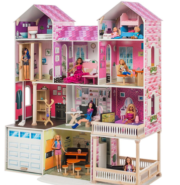 Особенность: Домик, выполнен в классическом стиле, и в благородном розовом цвете. Игрушку отличает яркий принт по дереву внутри дома, несомненно самое мощное наполнение аксессуарами и наличие интерактивных элементов, в данном домике юная принцесса может разместить всех своих любимых кукол формата Барби.