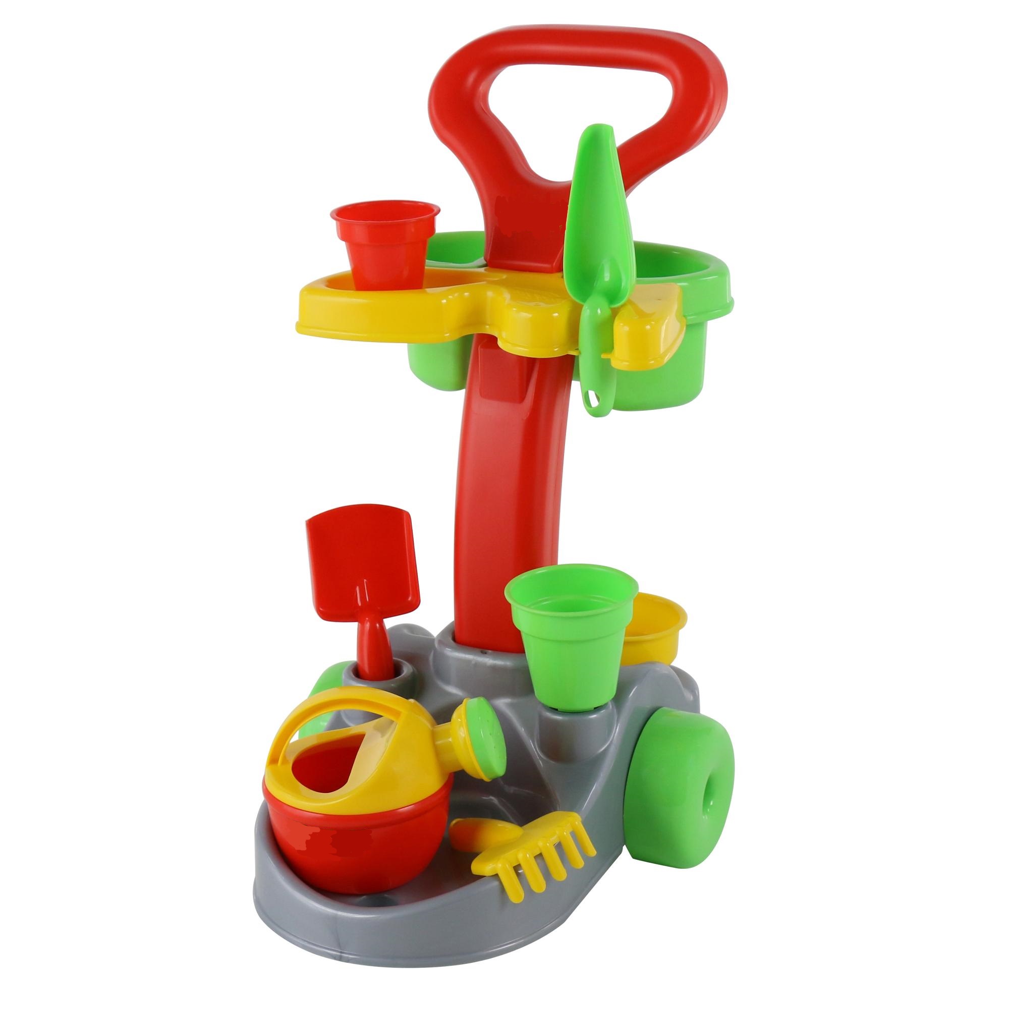 На тележке с большими устойчивыми колесами есть весь необходимый инвентарь – пусть игрушечный, но вполне пригодный для садово-огородных работ. В набор, кроме самой тележки, входит 7 предметов: три кашпо разных размеров и цветов, два разных совка – широкий и узкий, грабельки с короткой ручкой и яркая удобная лейка.