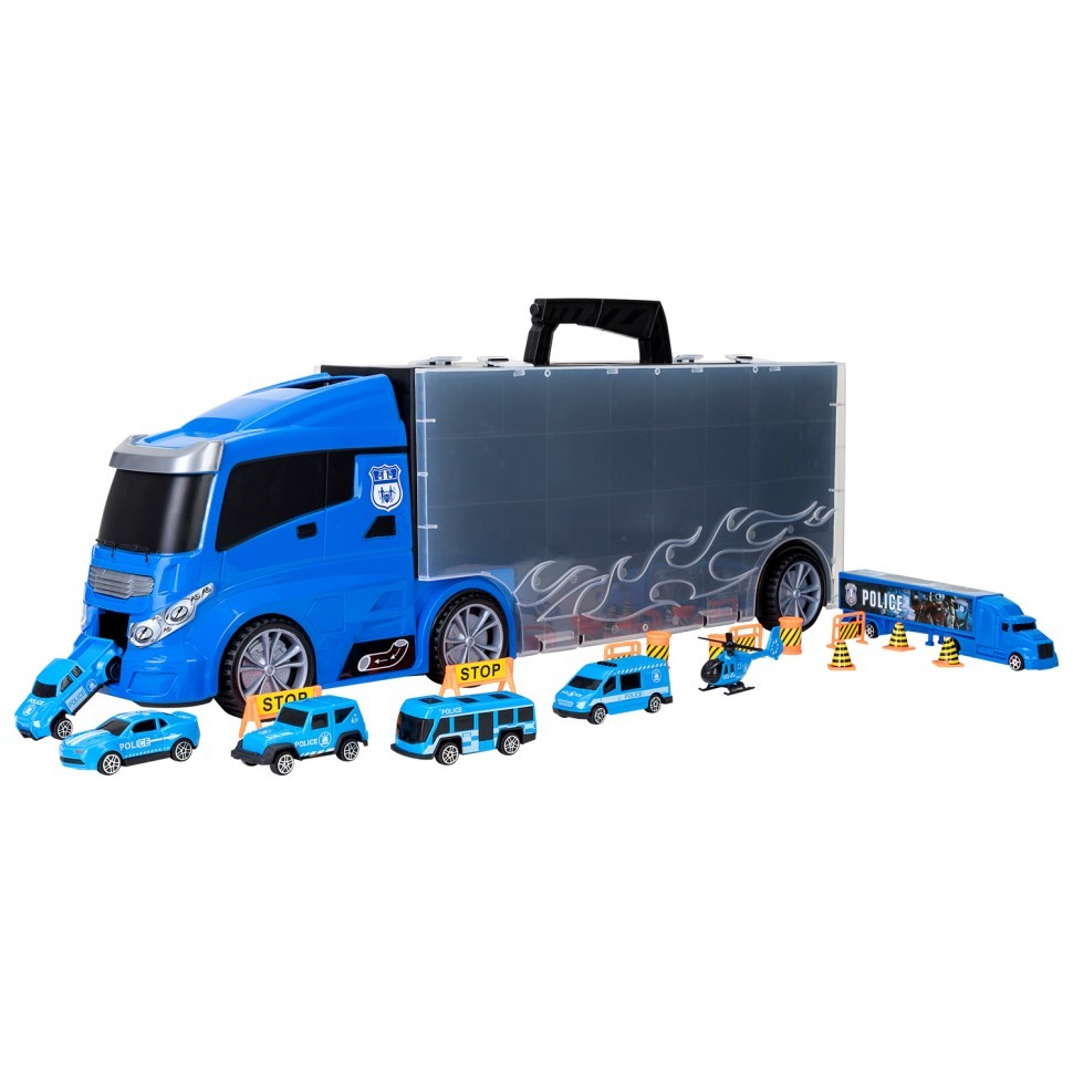 • В комплекте: автовоз-система хранения, 6 служебных автомобилей полиции, вертолет, 12 дорожных знаков.