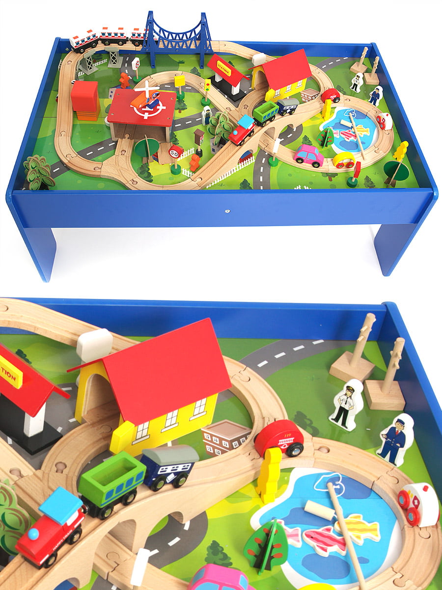 В наборе 88 игровых элементов: рельсы, мосты и опоры, фигурки изображающие людей, элементы инфраструктуры, машинки, локомотивы с вагонами.