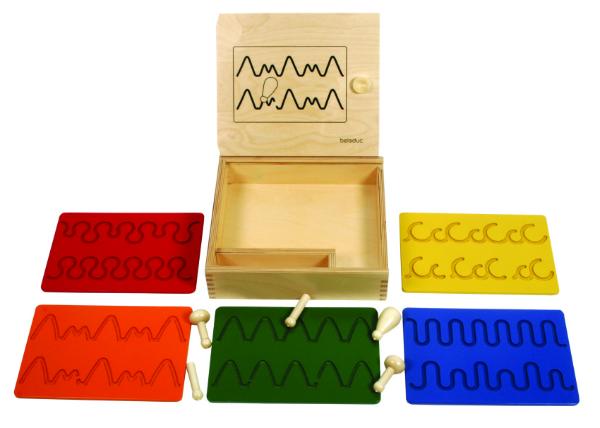 На каждой дощечке вырезаны узоры-канавки разных форм для того, чтобы дети могли тренировать движения рук и пальцев.