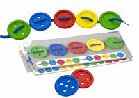 Состав: 40 пуговиц ярких цветов с отверстиями от 1 до 5, 12 карточек с заданиями, 5 разноцветных шнуров длиной 1 метр.
