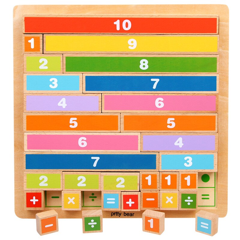 На лицевой части панели представлены счетные плитки в разных цветах, в левой части панели плитки прописаны на английском языке, в правой части пронумерованы от 1 до 10, в нижней части - 2 набора математических знаков. Блоки выполнены из устойчивого бука.